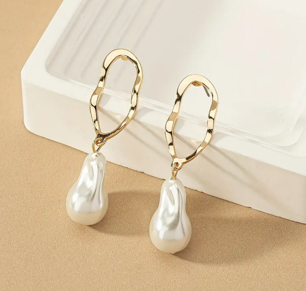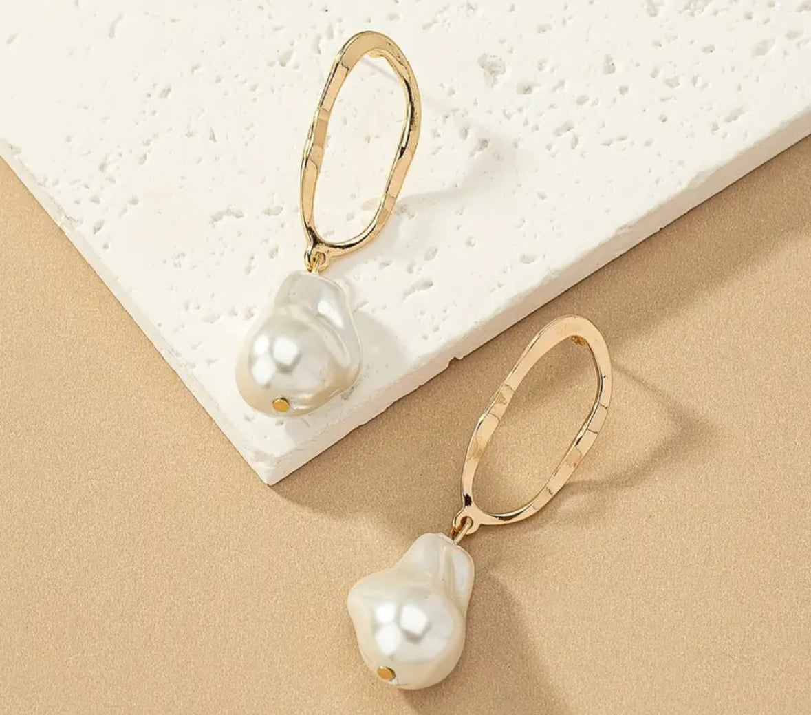 Brincos tipo argolas retangular com pérola e acabamento dourado.