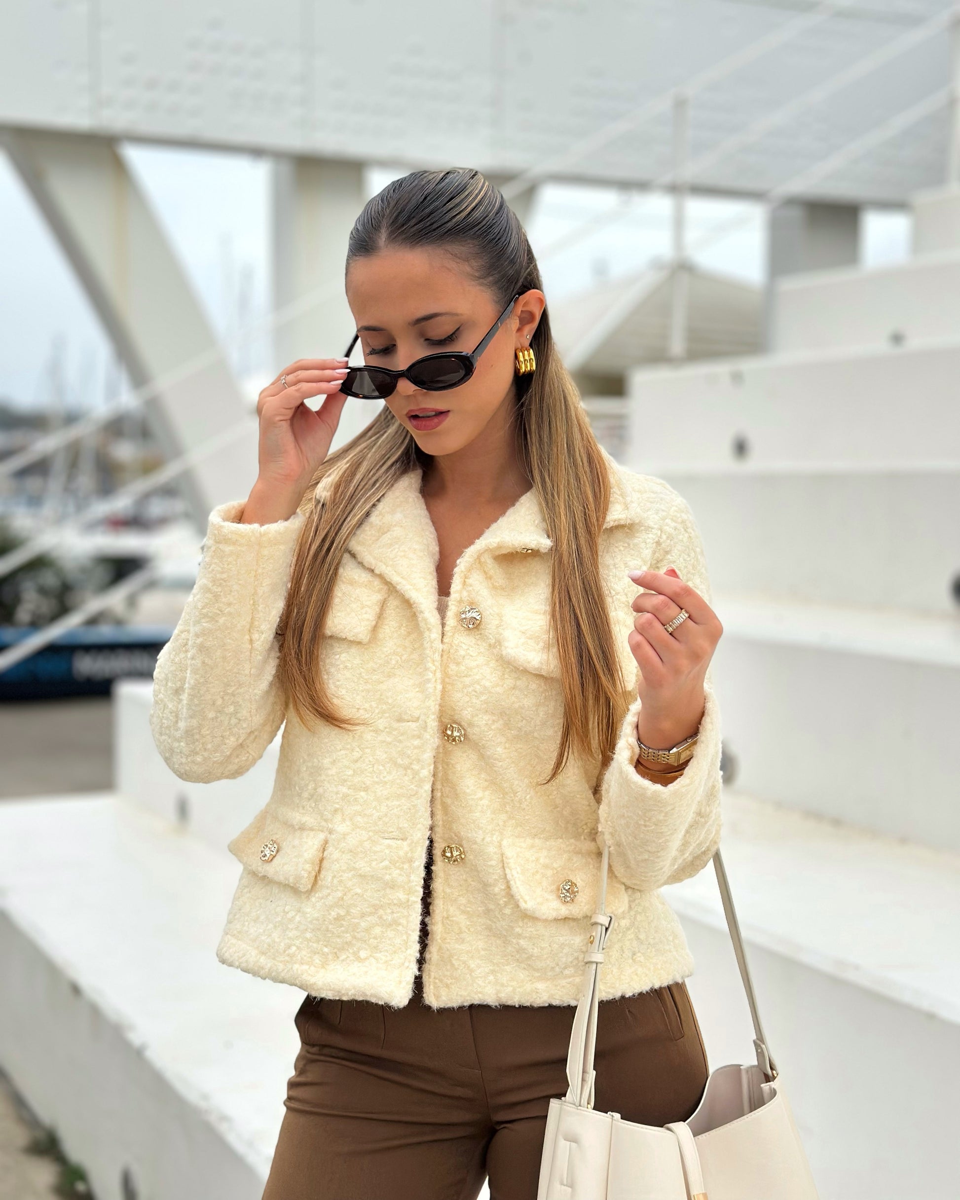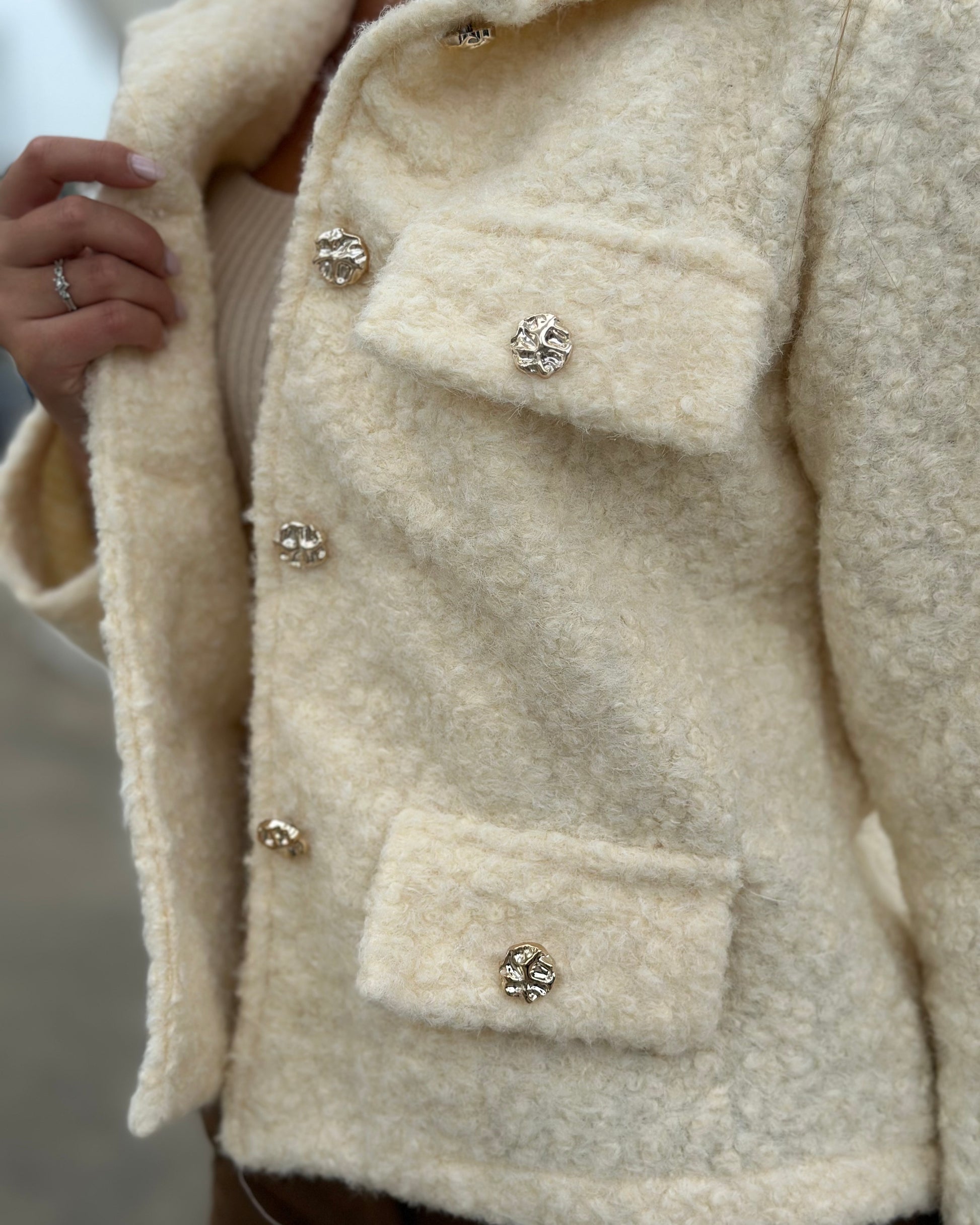 Casaco curto em tecido texturizado com toque macio e elegante. Confecionado com uma mistura de fibras que combina lã (25%), poliéster (70%) e elastano (5%), oferece conforto, estrutura e leve elasticidade.
