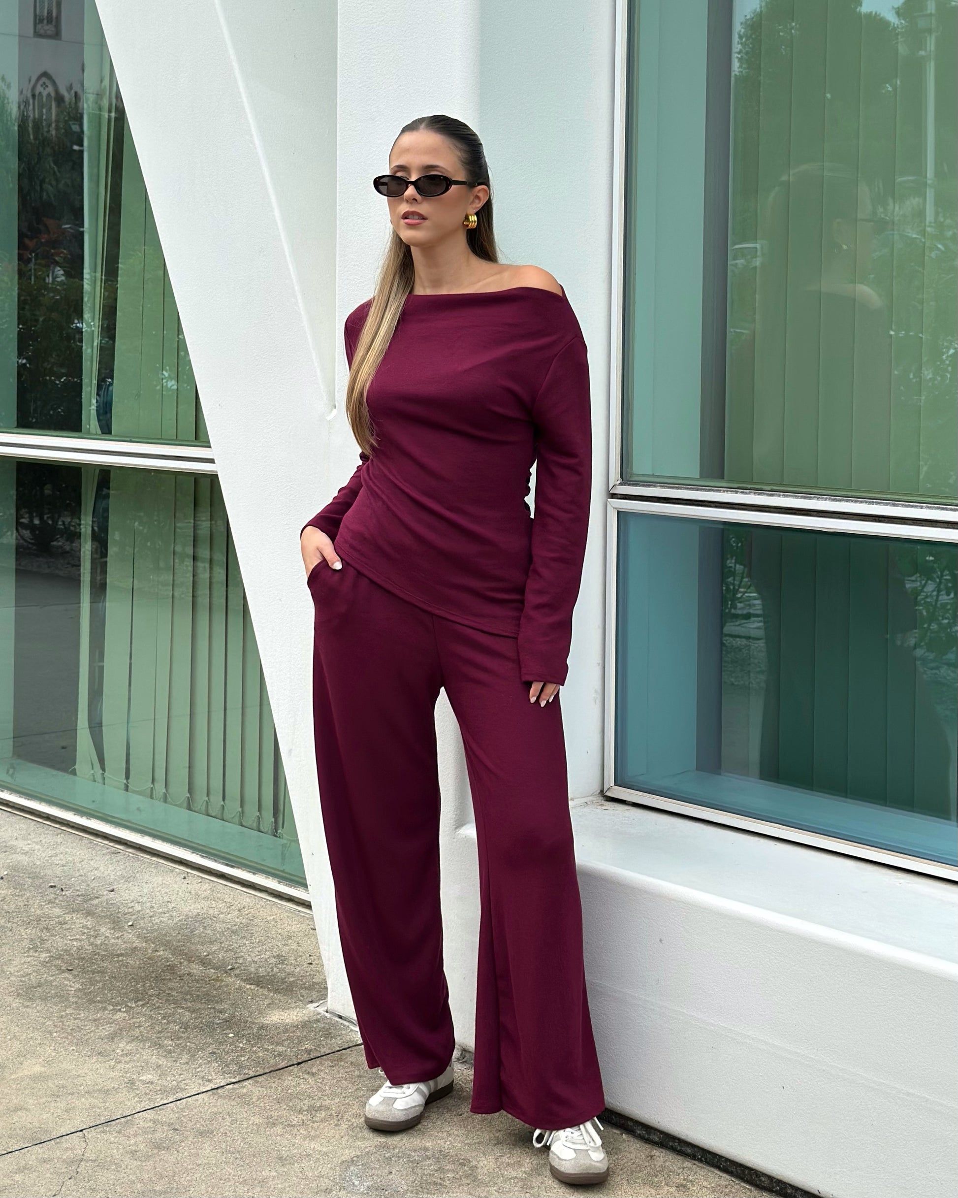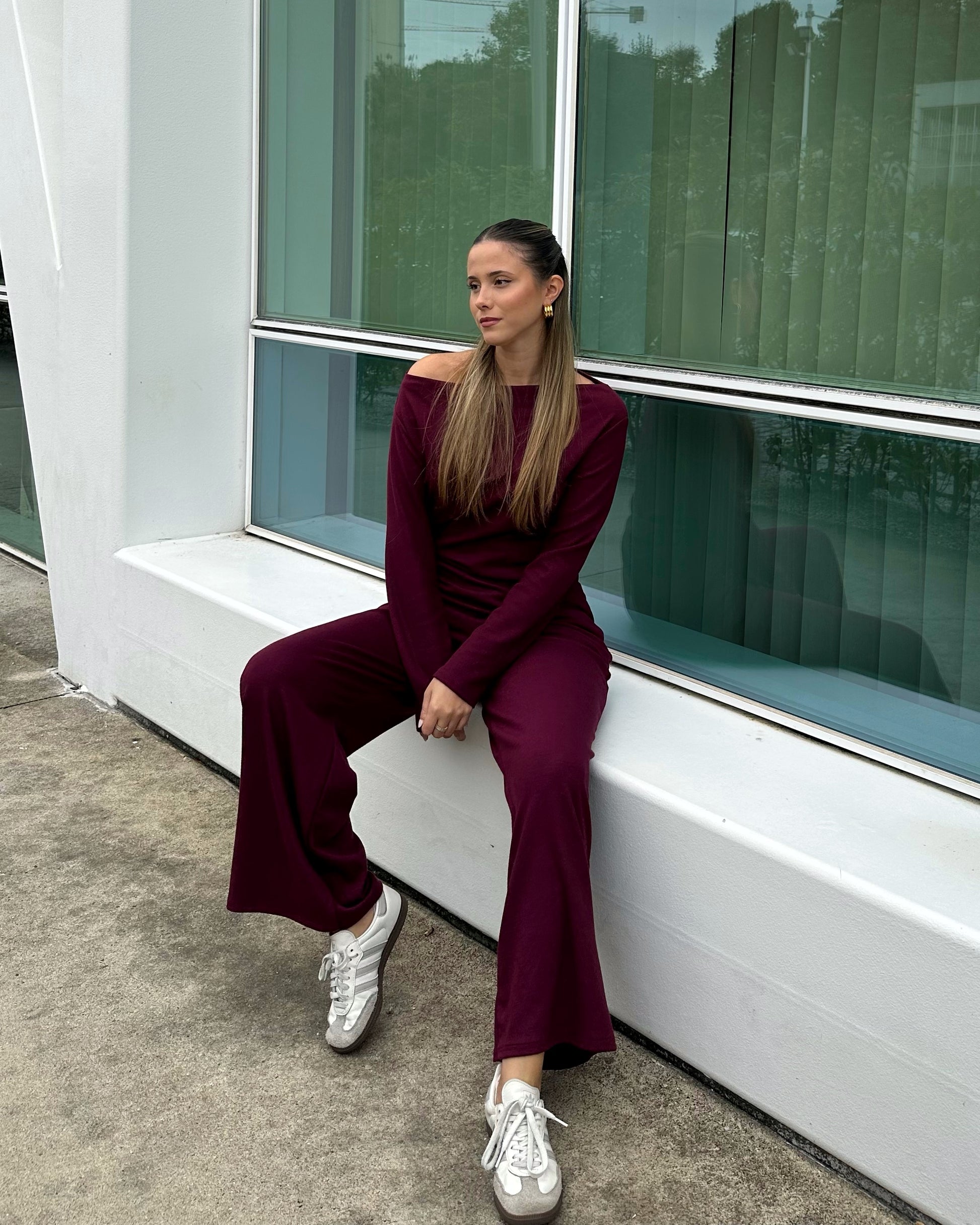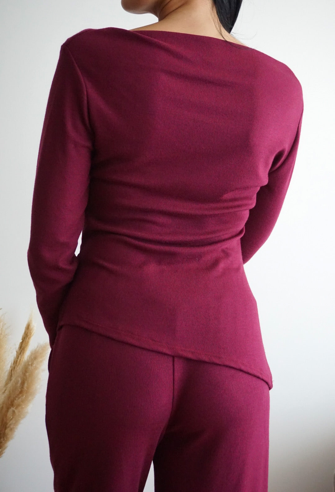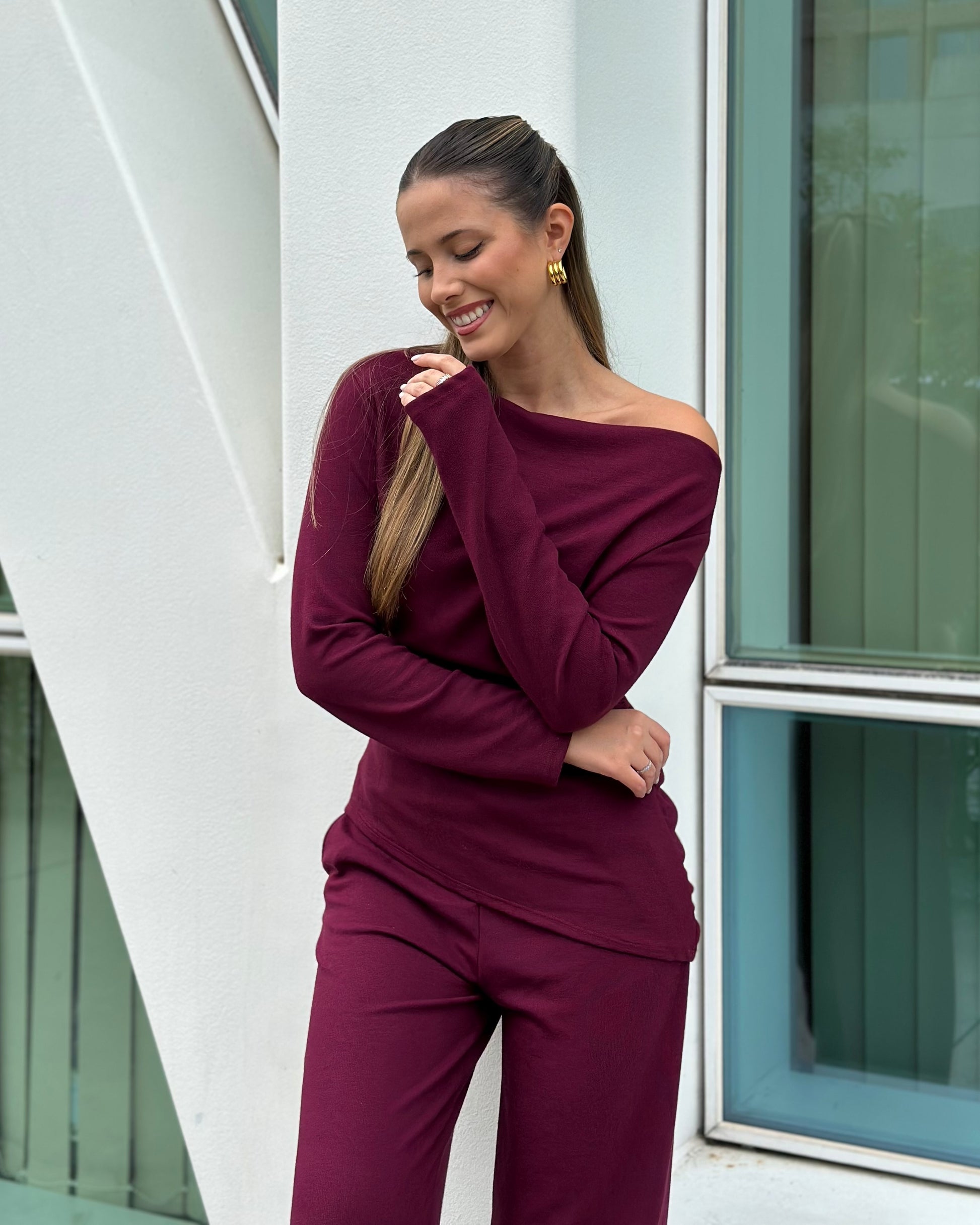Conjunto de malha fina cardada - calça e camisola cor bordô.