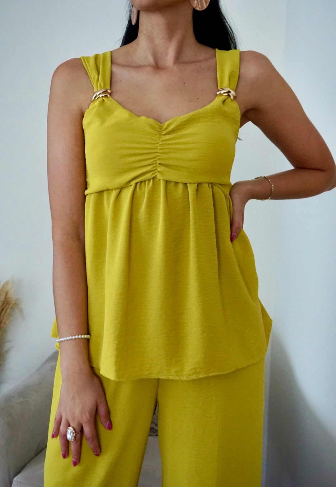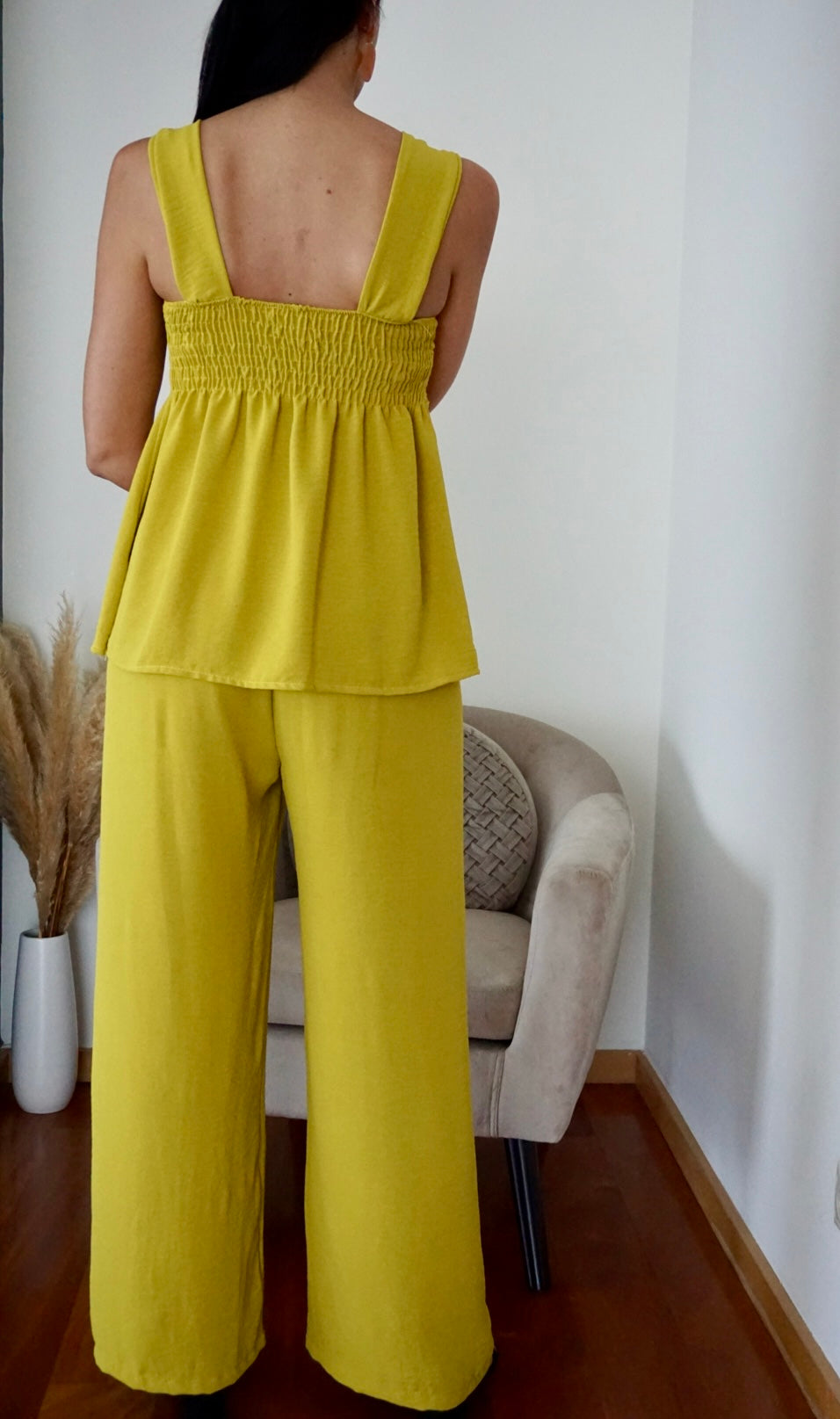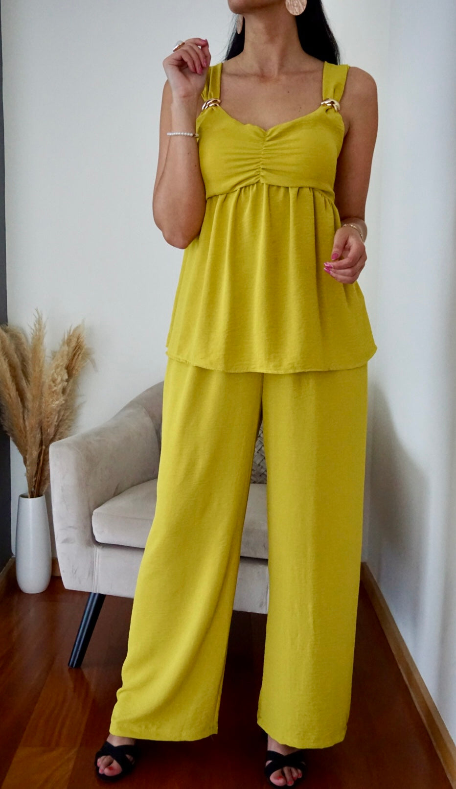 Disponível na cor mostarda, este conjunto com Top e Calça Pantalona é feito em tecido leve e fluido, perfeito para os dias mais quentes ou para momentos em que o bem-estar e a elegância caminham juntos.