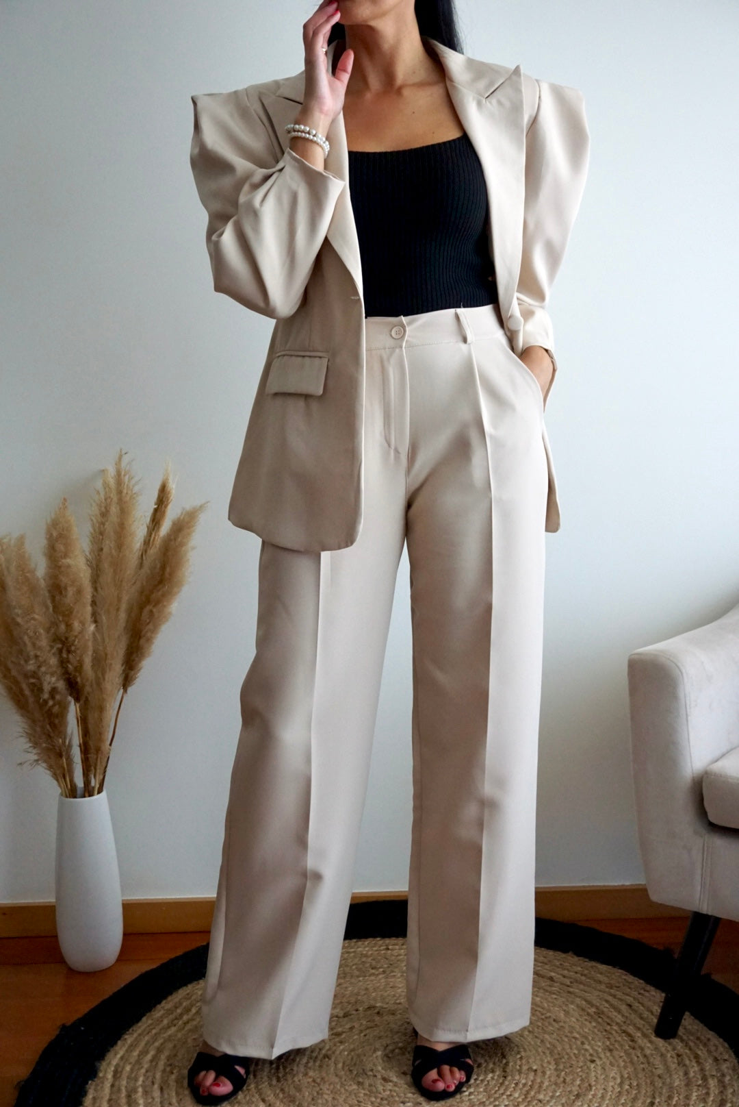 O corte versátil e o tecido fluido fazem deste conjunto um tamanho único que veste S, M e L, adaptando-se a diferentes silhuetas e estilos.