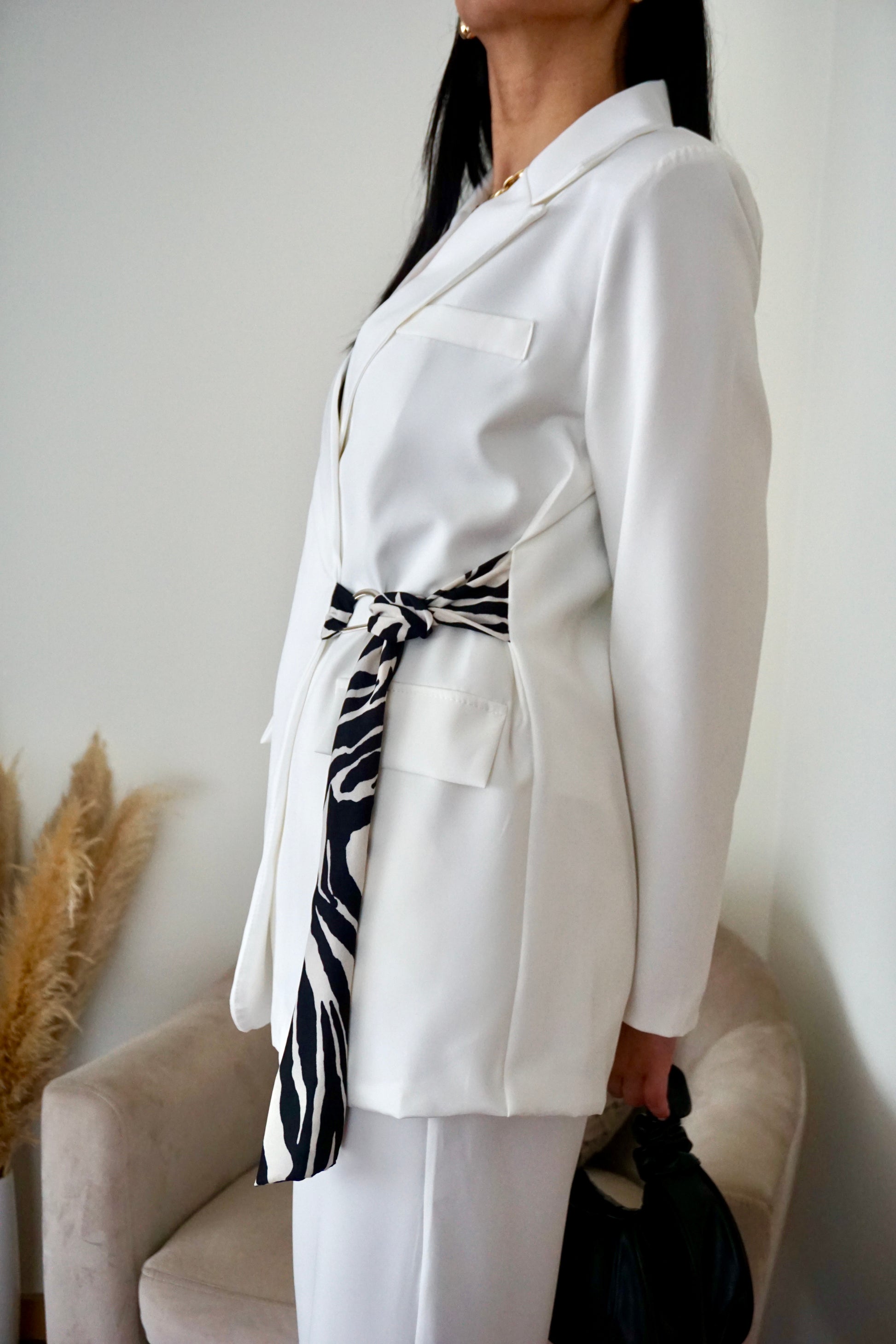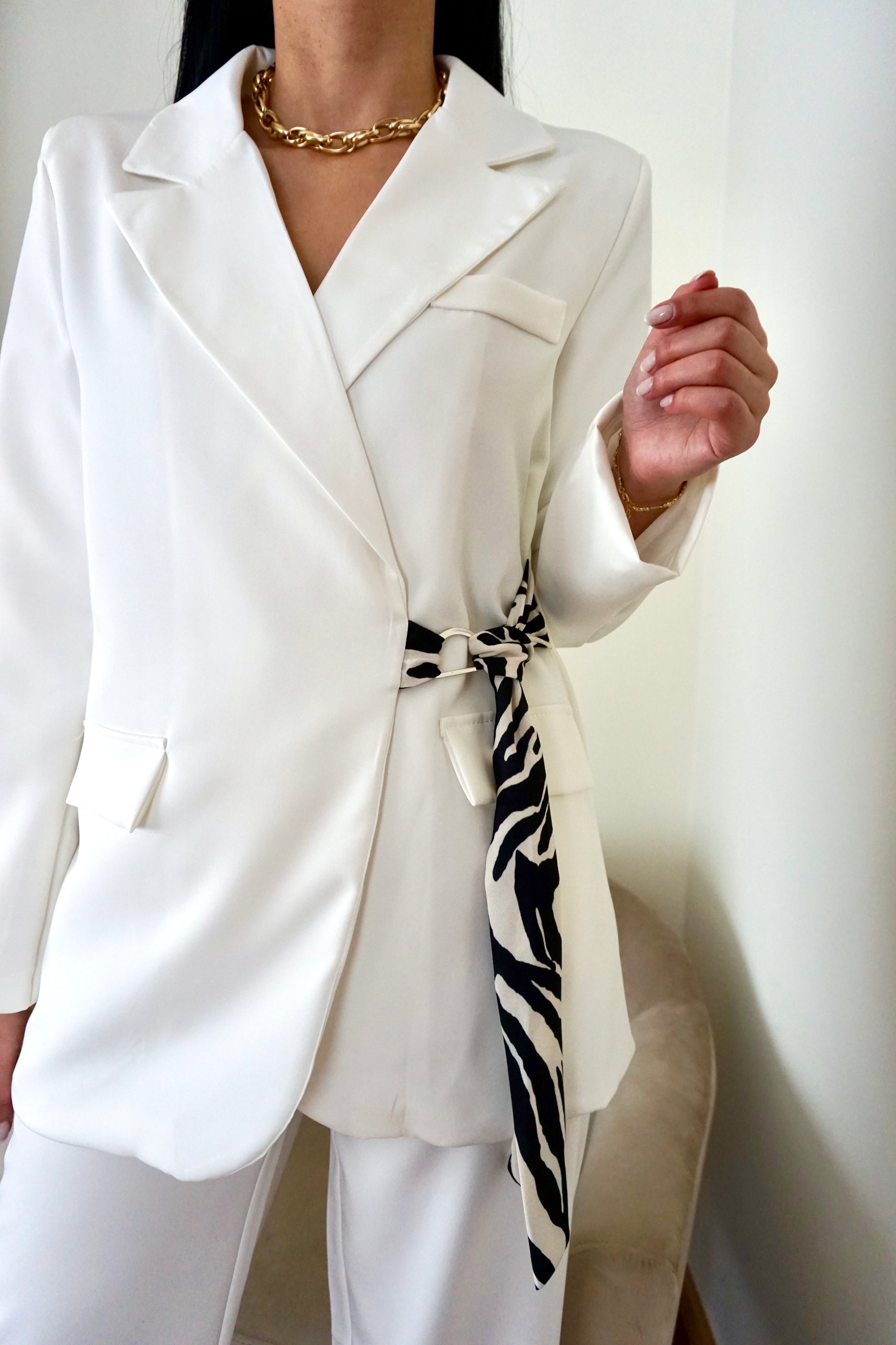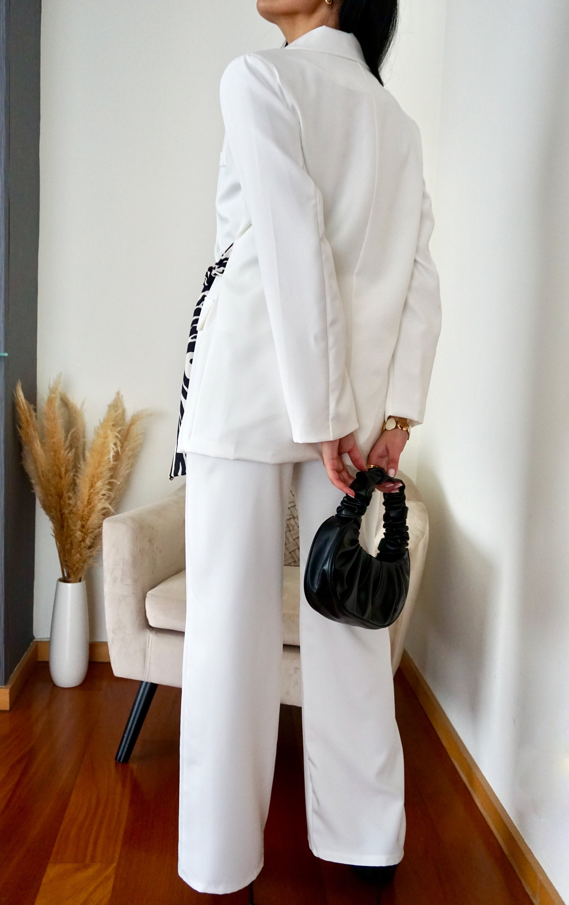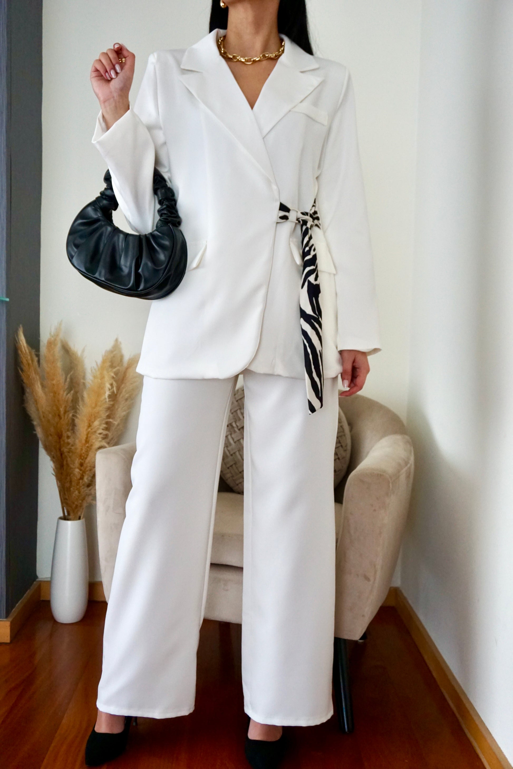 Elegante conjunto composto por blazer e calça. O blazer é forrado no interior e fecha com um cinto forrado com padrão. Calça corte wideleg, com cintura elástica e botão e fecho de aperto.