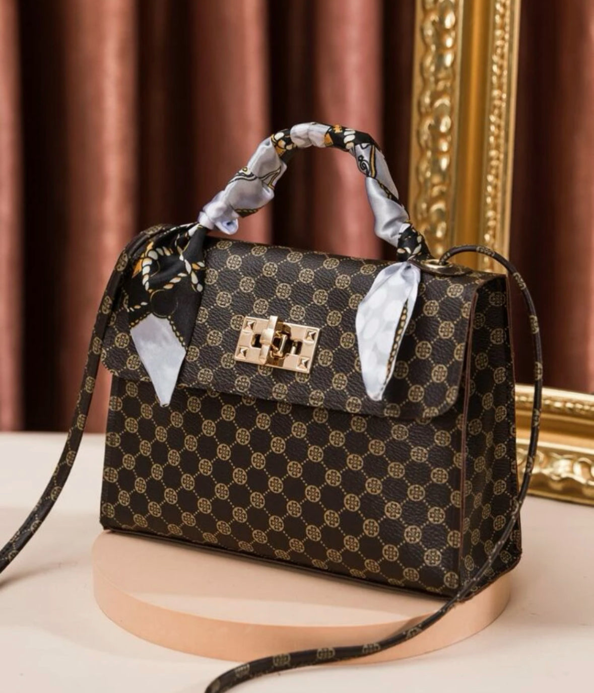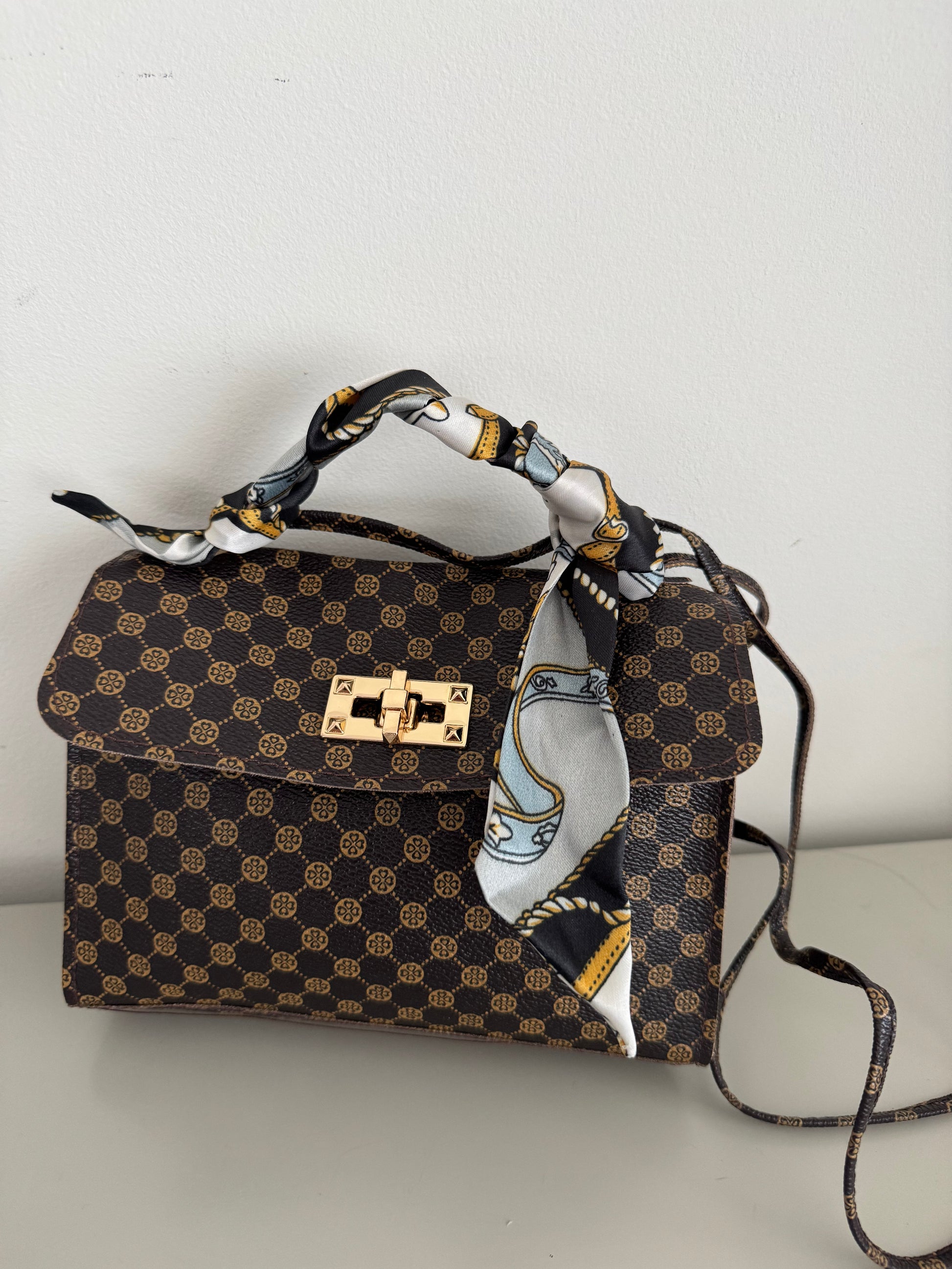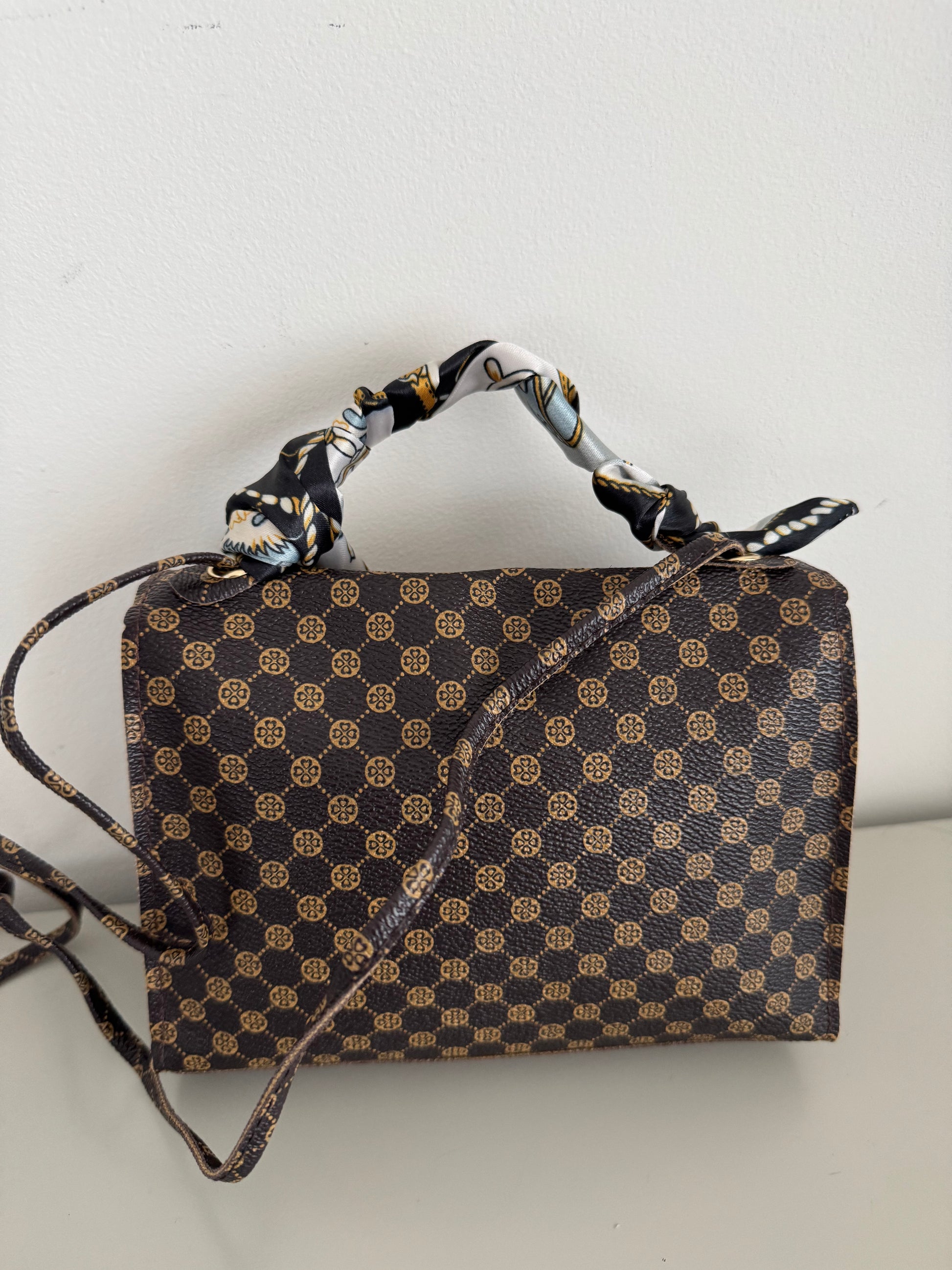 Mala pequena a tiracolo cor castanha com padrão e com um lenço na pega.