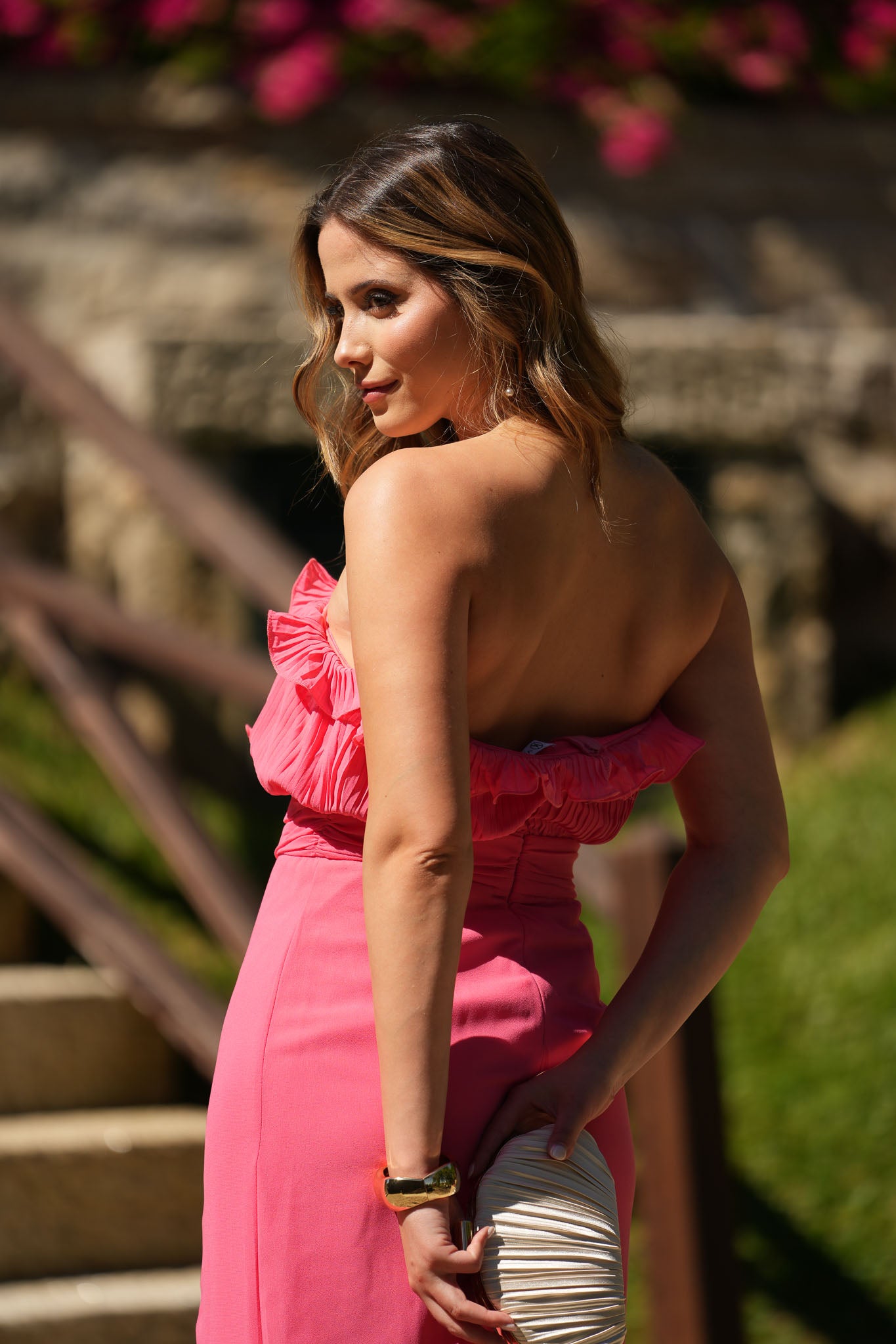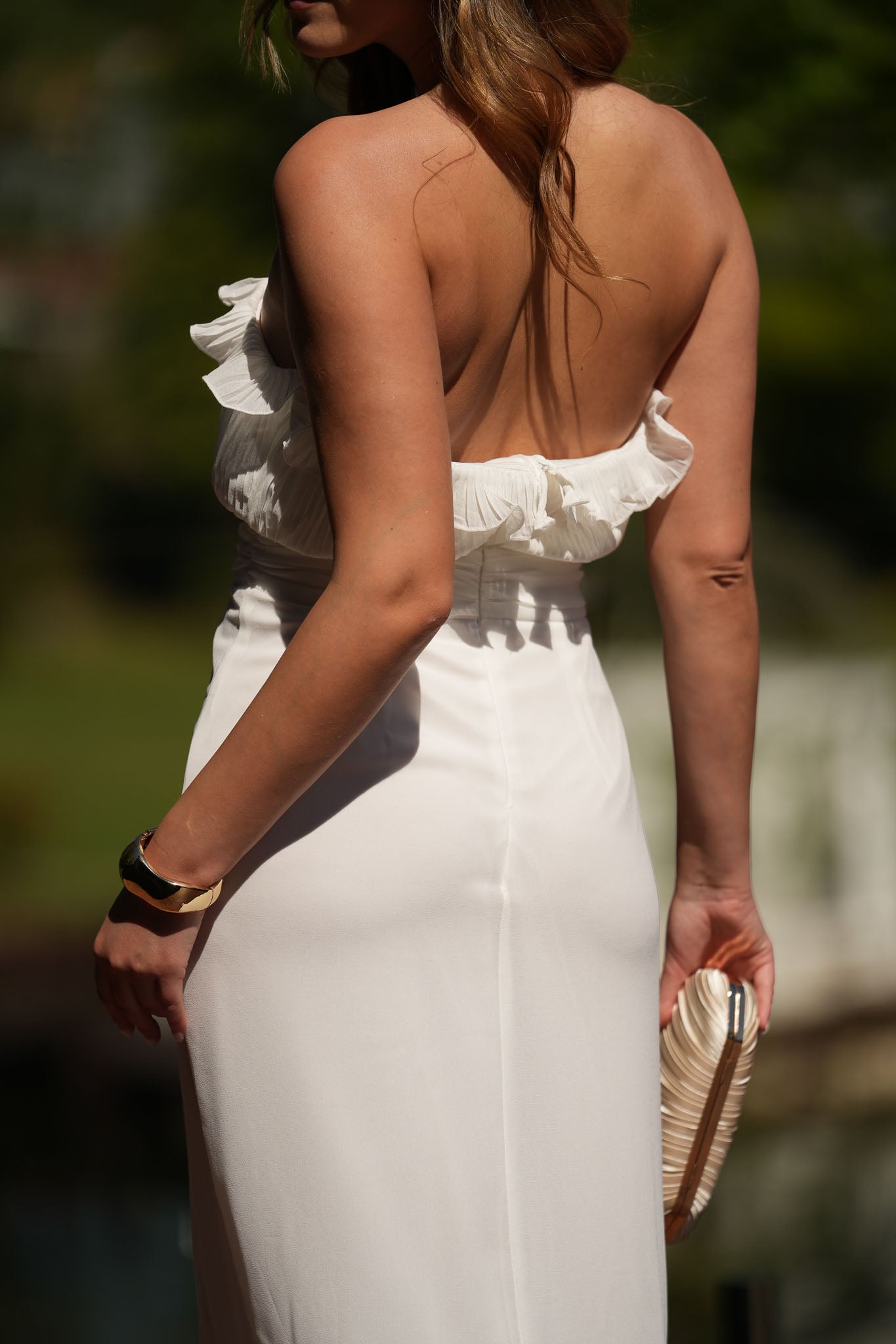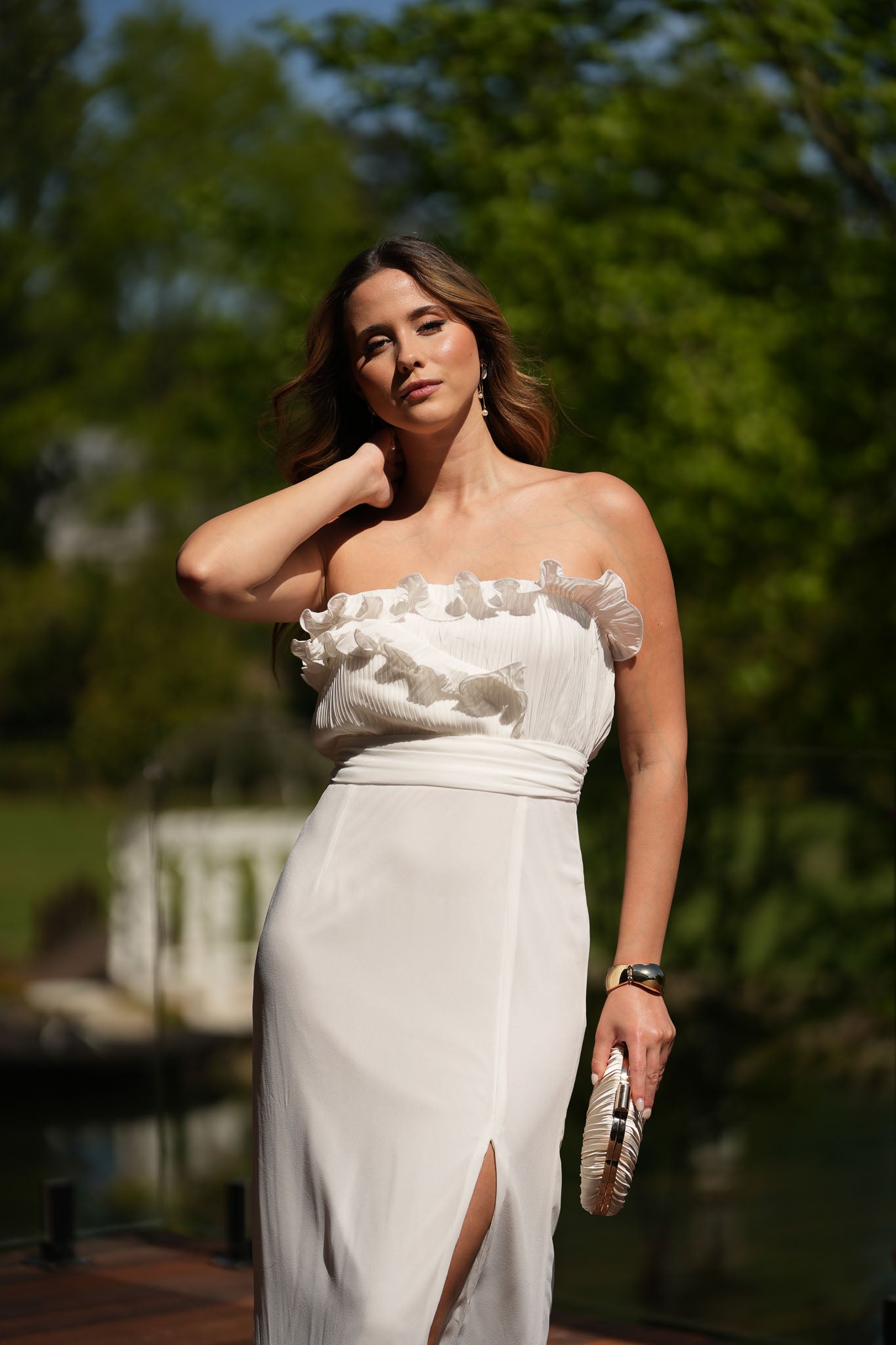 Vestido midi cai-cai com corpete de folhos e racha lateral